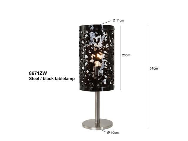 1x Tafellamp uit de serie Lichtval, 8671 zwart. Diameter ca. 10cm en hoogte ca. 31cm. Gewicht 2 kg. Deze tafellamp is uitgevoerd met een E14 fitting maximaal 40 Watt.