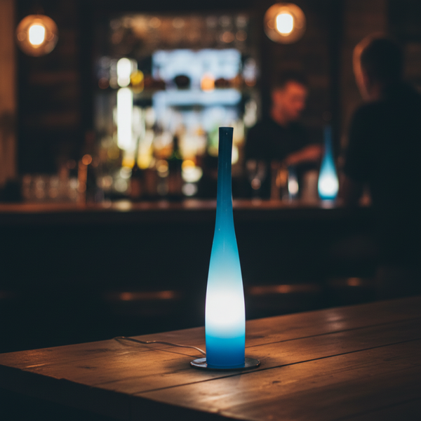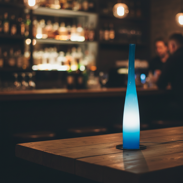 Stijlvolle tafellamp in blauw, uitgevoerd met een elegante blauw glazen kelk die zorgt voor een sfeervolle en warme lichtuitstraling. Dankzij het slanke ontwerp en de diepe blauwe kleur is deze lamp een echte blikvanger in elk interieur.
