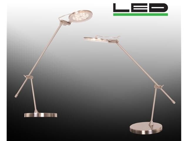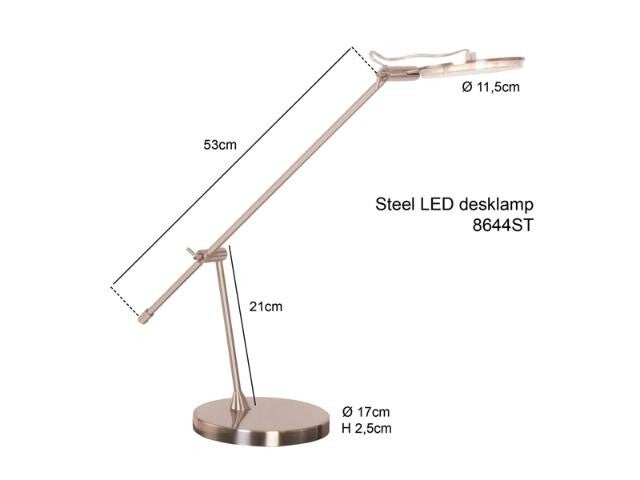 1x Tafellamp uit de serie Modern Design 8644 staal. Diameter ca. 17cm en hoogte ca. 45cm. Gewicht 4 kg. Deze tafellamp is uitgevoerd met een Led-module van 20x 0,2Watt en een schakelaar in het snoer. De arm is op twee plekken kantelbaar