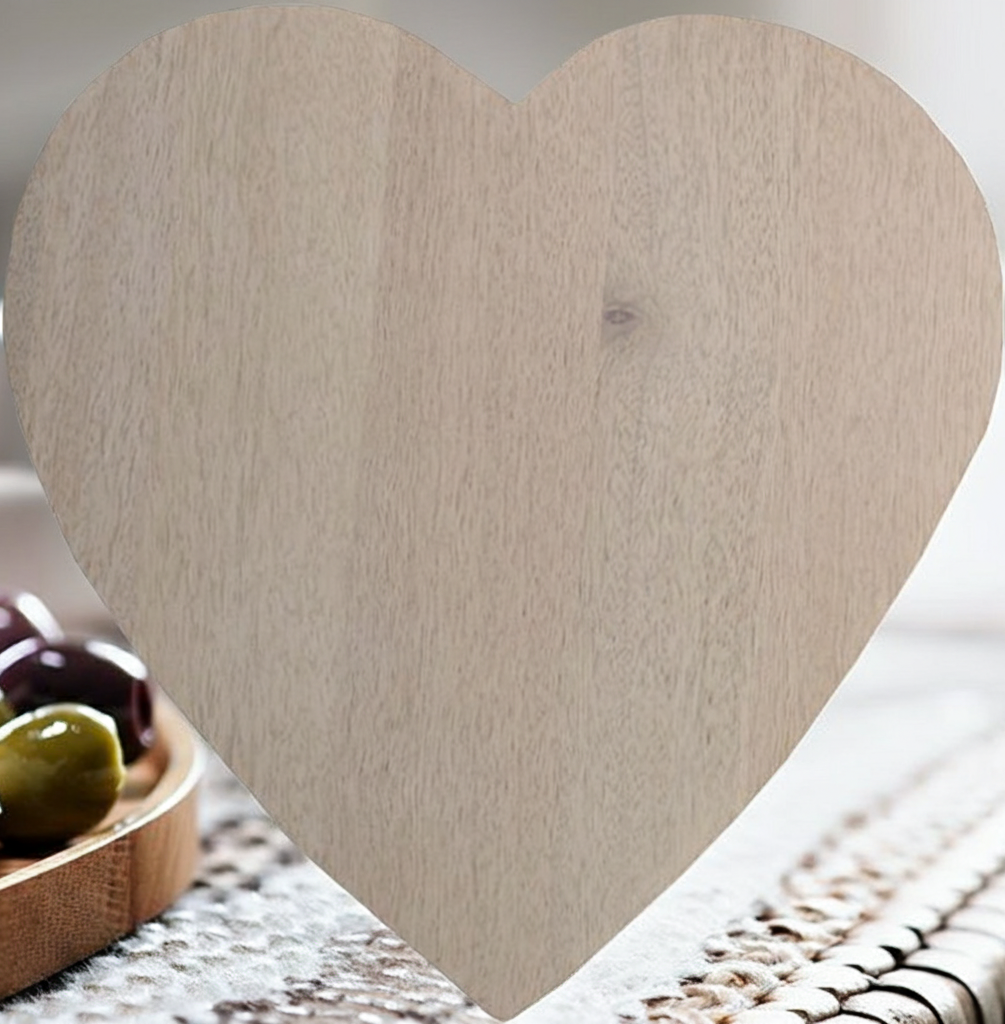 De serveerplank heeft een hartjesvorm en is gemaakt van mangohout