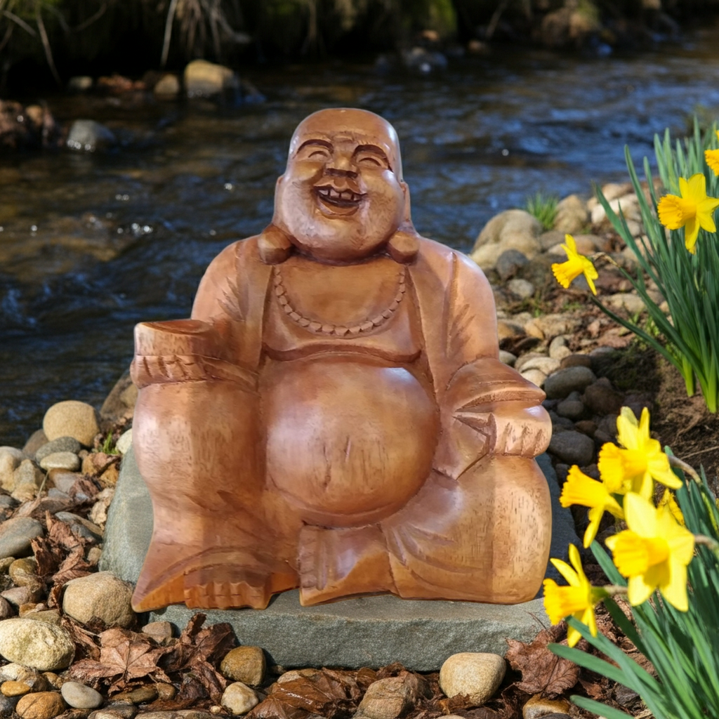 Houten beeld van een lachende boeddha